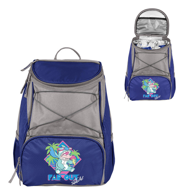 The PTX Backpack Cooler with Disney Lilo & Stitch design Far Out features a fully-insulated interior liner that is also water-resistant, you can use it as a food and beverage tote or as an all-around activity tote. Backpack also features golf cart harness, five separate pockets, and front-mounted stretch cord. 20 can capacity. Measures: 11'' x 7'' x 12.5''.