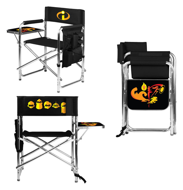 The Disney The Incredibles Folding Sports Chair by Picnic Time features a sturdy aluminum frame, adjustable detachable shoulder strap, side pockets, & insulated drink holders. Chair features 19.5'' wide seat and holds up to 300 lbs. Folded measures 19 x 4.5 x 33 inches and expanded measures 19 x 24 x 33. Side table measures 14.5 x 11 inches and holds up to 10 lbs.