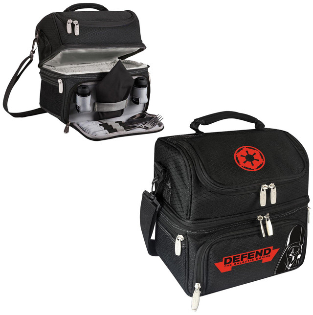 The Pranzo insulated lunch box is made of polyester and features adjustable shoulder strap, soft grip handle, side mesh pockets, and a hidden flatware section with 1 stainless steel fork, knife, and spoon, salt & pepper shaker and 1 cotton napkin. 8 can capacity. Measures: 12'' x 8'' x 11''.