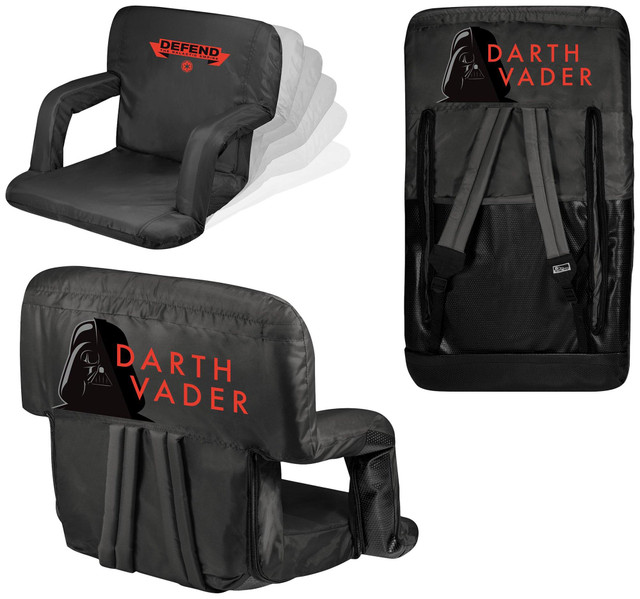 The Ventura Seat by Oniva is a portable recreational recliner with armrests and adjustable backpack straps you can take just about anywhere. Seat features Star Wars Darth Vader design, six backrest positions, and integrated armrests. Measures 20''L x 32''W x 32''H. Weighs 7.5 lbs.