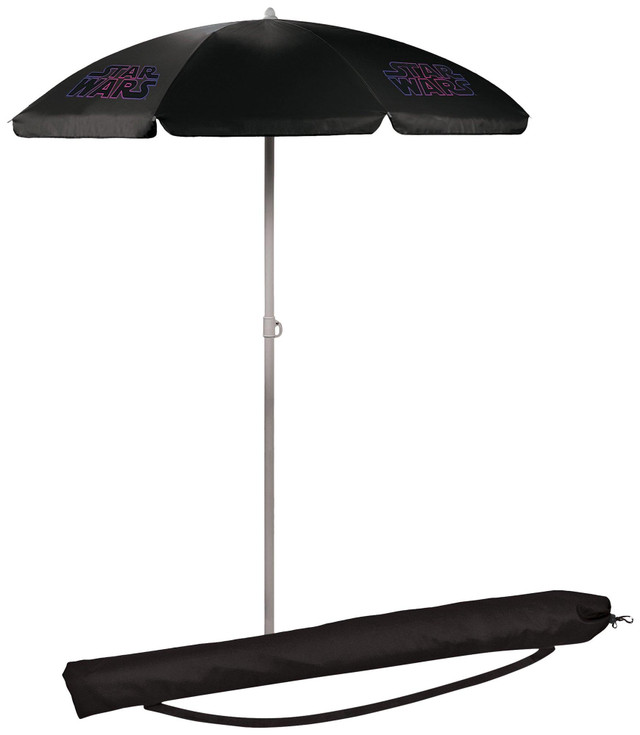 This umbrella is perfect for the beach, tailgating, or picnics. The pole measures 81.5'' tall and 1.3'' diameter with a tilting option as well as pointed end for easier penetration into the ground. Umbrella measures 5.5' across and features Star Wars Logo design. Sturdy drawstring bag with strap included.