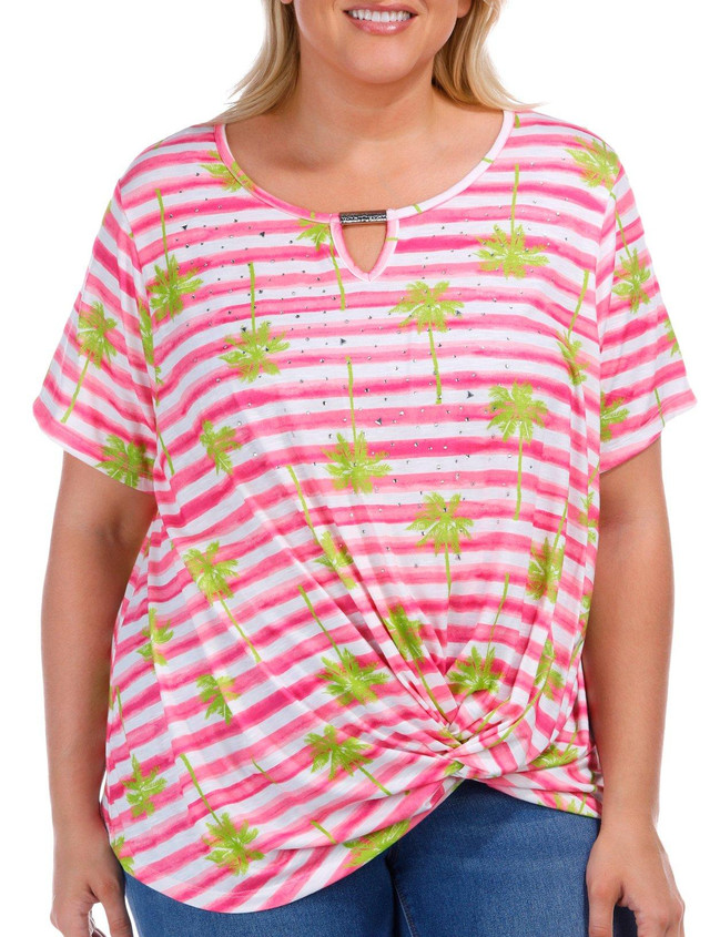 Shine bright with this short sleeve top featuring dazzling rhinestone embellishments, a front twist hem and a stylish print pattern. Crafted from soft, comfortable fabric, this top ensures all-day ease and elegance. Whether you're dressing up for a dinner out or keeping it casual, this versatile piece adds a touch of sparkle and sophistication to your wardrobe. The fabrication is 95% polyester and 5% spandex. Top length measures approximately 27 in.