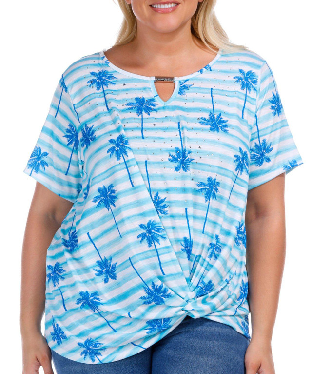 Shine bright with this short sleeve top featuring dazzling rhinestone embellishments, a front twist hem and a stylish print pattern. Crafted from soft, comfortable fabric, this top ensures all-day ease and elegance. Whether you're dressing up for a dinner out or keeping it casual, this versatile piece adds a touch of sparkle and sophistication to your wardrobe. The fabrication is 95% polyester and 5% spandex. Top length measures approximately 27 in.