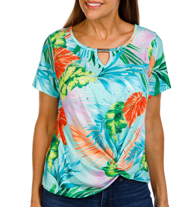 Add sparkle with this short sleeve top with rhinestone embellishments, a keyhole neckline with metal emblem, and a stylish tropical print. A front twist hem enhances the flattering fit, while soft, comfortable fabric makes it perfect for day-to-night wear. Versatile and chic. Fabrication is 95% polyester and 5% spandex. Top length measures approximately 27 in.