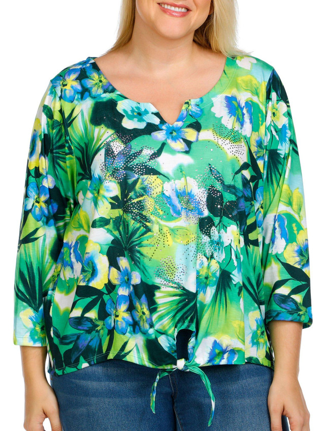 This Plus 3/4 Sleeve Floral Print Top is made from a soft blend of polyester and spandex. It features a lively floral print with sparkling rhinestone accents and a stylish tie front hem, adding a touch of charm to your everyday look.