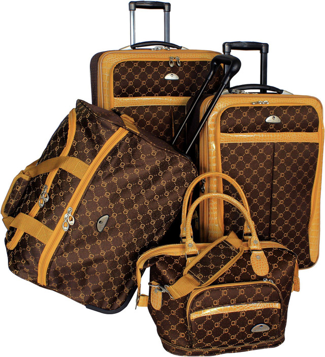 American Flyer Signature Luggage Set includes 24'' & 20'' rolling uprights as well as 18'' rolling duffel and cosmetic satchel (11.5'' x 10'' x 8''). Suitcases features telescoping handles, inline skate wheels, mesh pocket lid, and expands 2.5'' additional inches.
