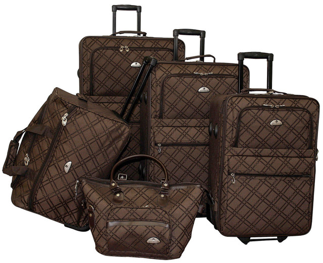 American Flyer Pemberly Buckles Set includes 28'', 25', & 20'' expandable wheeled uprights as well as wheeled duffel (18'') & cosmetic satchel (13'' x 8'' x 7''). Set features zippered pocket, inline skate wheels, locking telescoping handle, top & side handle, and fully lined.