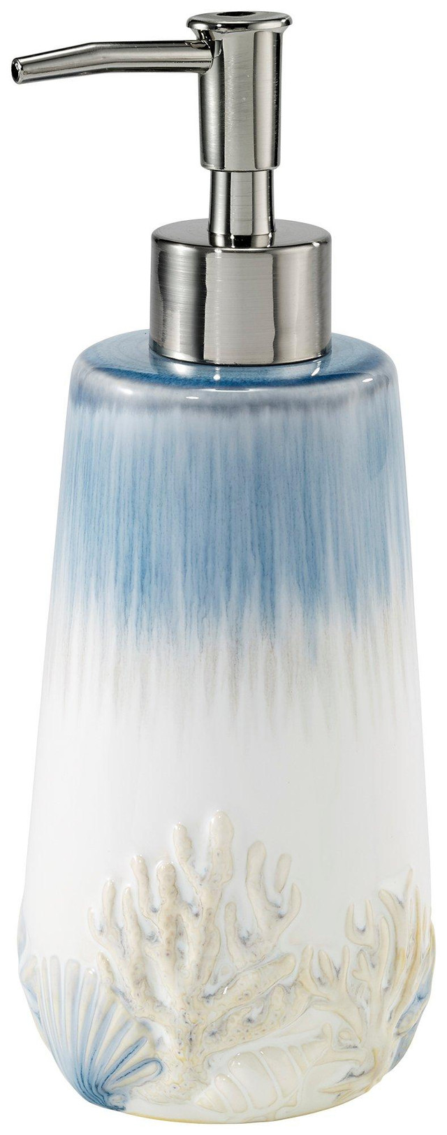The Avanti Abstract Coastal Lotion Dispenser is decorated with blue and beige irregular brushstrokes on a white base. Coral, starfish and shells in beiges and blues wrap the bottom. Made of durable, hand-painted ceramic. Imported. Measures 3.07 in x 3.07 in x 7.91 in.