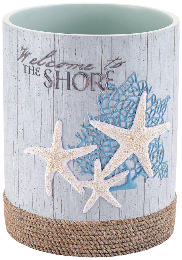 Avanti Beachcomber Wastebasket is crafted in resin with incredible detail of a coral and sand dollar motif set on an aqua clapboard background and finished with rope detail at bottom. Measures: 8.27'' x 8.27'' x 10.24''.
