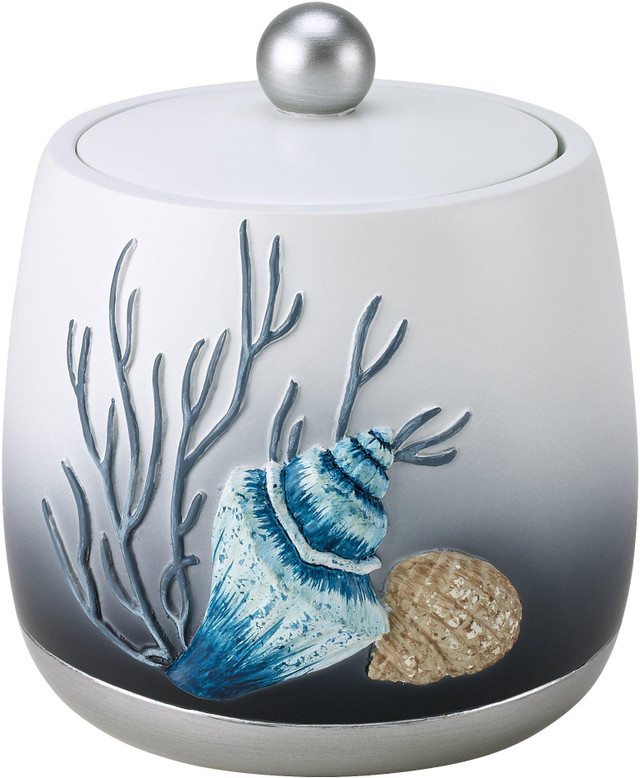 The Avanti Blue Lagoon Jar is decorated with raised starfish, shells & coral in shades of blue & beige on an ombre base of off-white to dark blue and a silver border on the bottom. The cover is topped with a starfish for easy removal. Measures: 4.33 x 4.33 x 4.72.