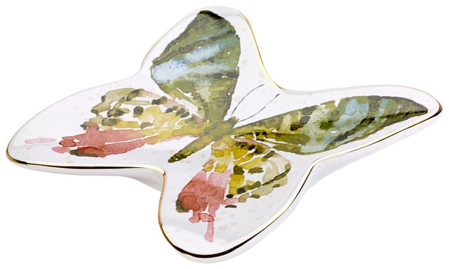 Avanti Butterfly Garden Soap Dish is decorated with an intricately detailed rose and butterfly design on a ceramic base and finished with gold piping. Measures: 5.1'' x 4.7'' x 1.2''.