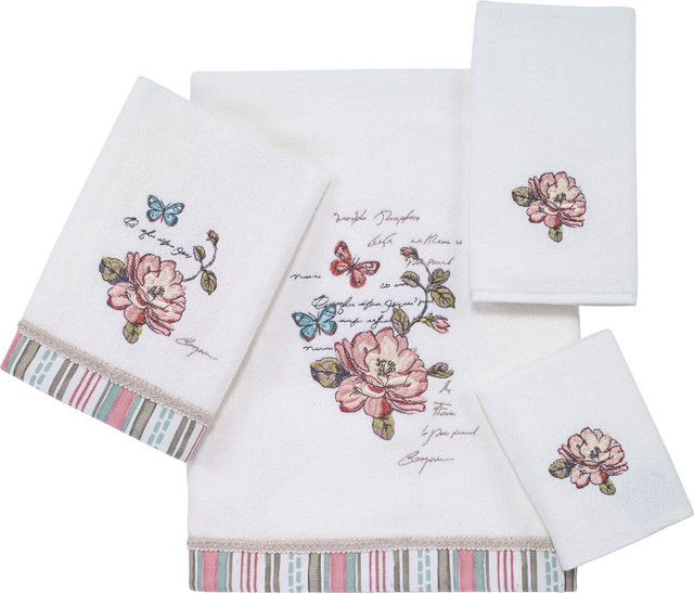 Avanti Butterfly Garden Collection features beautifully embroidered design. Bath and hand towel features a coordinating fabric border. Towels Measure: Bath 27'' x 50'', Hand 16'' x 30'', Fingertip 11'' x 18'', and Washcloth 13'' x 13''.