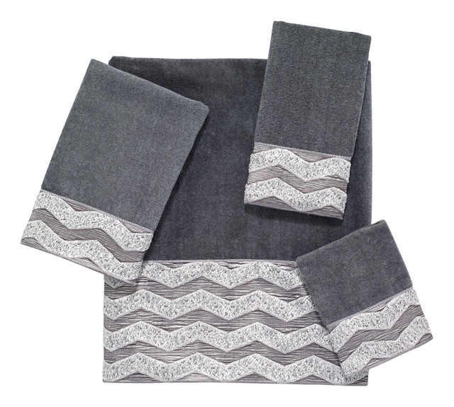 With its beautifully woven jacquard chevron pattern border in complementary shades of greys on a 100% cotton towel. The Avanti Chevron Galaxy Bath Towel adds an updated, contemporary feel to any bathroom. Imported. Bath Towel measures 50 in x 27 in. Hand Towel measures 30 in x 16 in. Washcloth measures 13 in x 13 in. Fingertip Towel measures 11 in x 18 in.