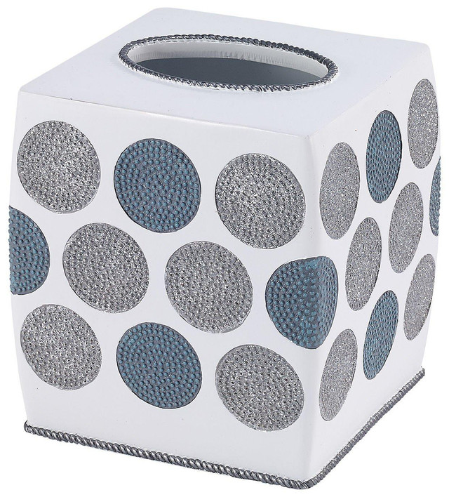Avanti Dotted Circles Tissue Cover features grey and blue with metallic accents on a white base in durable resin. Measures: 5.3'' x 5.3'' x 6.1''.