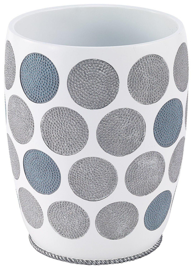 Avanti Dotted Circles Wastebasket will add a contemporary flair to any bathroom. Wastebasket features grey and blue metallic accents on a white base in durable resin. Measures: 8.1'' x 8.1'' x 10.1''.