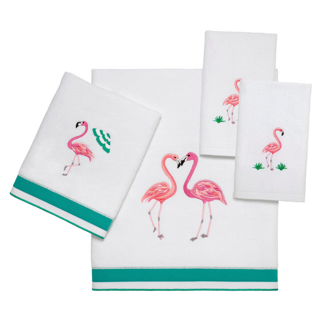 The Avanti Flamingo Paradise Bath Towel is decorated with 2 embroidered flamingos in light and dark pink standing beak-to-beak on a white ground. The white 100% cotton velour towel ,Bath Towel 27 x 50, Hand Towel 16x30, Fingertip Towel 11x18 is with a coordinating fabric trim to finish the look. Matching accessories, shower curtain, rug available.