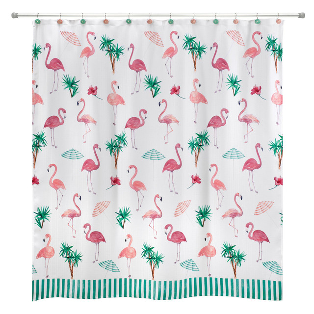 The Avanti Flamingo Paradise Shower Curtain features a beautifully printed design mixing pink flamingos, green and white umbrellas, palm trees and pink hibiscuses. The bottom is finished with a green and white vertical border. Measures 72 in. x 72 in.