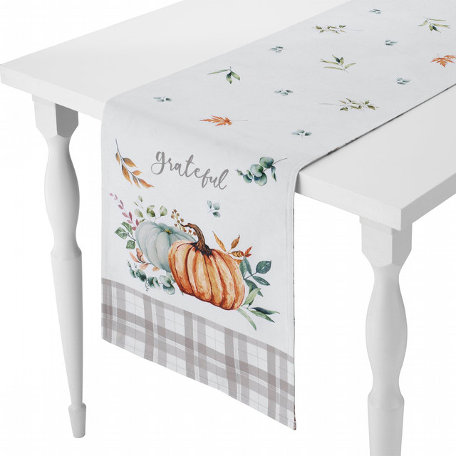 The Avanti Grateful Patch 14 x 72 Table Runner is decorated with printed pairs of colorful pumpkins and leaves with multi-shade linen borders on both ends. The center features tossed colorful fall leaves on an ivory ground. The textured cloth is 80% polyester/20% cotton for easy care.