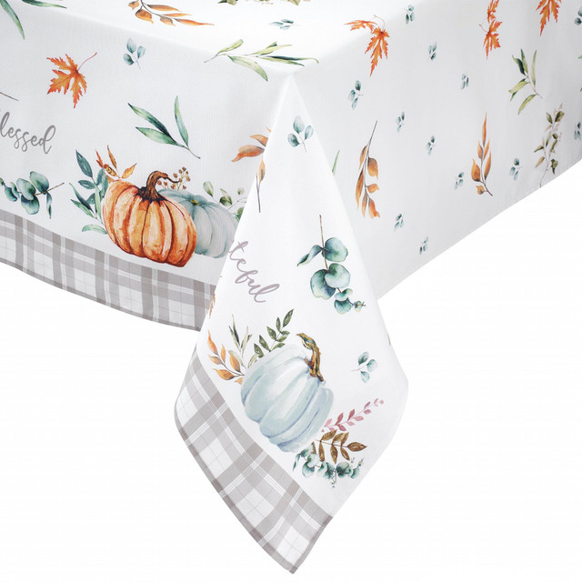 The Avanti Grateful Patch Rectangular Tablecloth features printed colorful pumpkins over multi-shade linen borders lining both sides of the cloth. The center is decorated with tossed colorful fall leaves on an ivory ground. The textured cloth is 80% polyester/20% cotton for easy care.