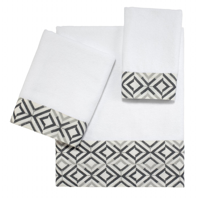 The Avanti Harlow Ivory Bath Towel features offset rows of concentric diamonds intricately embroidered on 100% polyester cloth. The towel is sheared for a silky, smooth, shimmering ground, the perfect complement to this contemporary design.