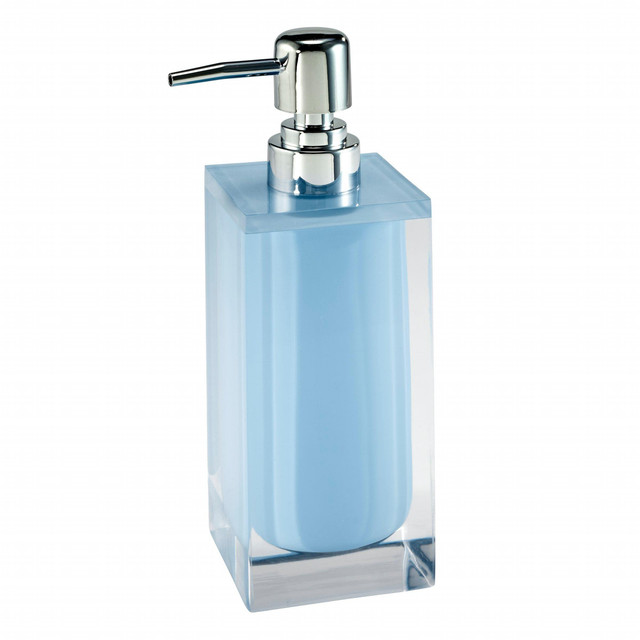 The Izod Marina Blue Soap/ Lotion/ Sanitizer Dispenser features a clear resin exterior that shows off the medium blue soap reservoir on the inside. The shiny silver pump coordinates nicely with the sleek, modern look. Made of durable resin for years of use.