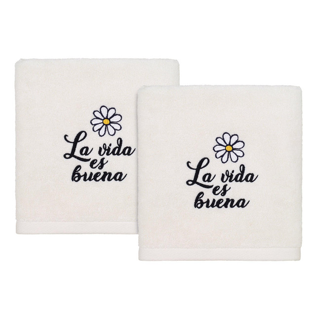 The Avanti La Vida es Buena (Life is Good) 2-pack of decorative hand towels features the saying embroidered in black script with a white and yellow daisy above. The ivory 100% cotton towels measure 16 x 26. Woven out of 2-ply ringspun cotton for superior softness and absorbency. Dimension - L = 28 x W = 16 x H= 0.01