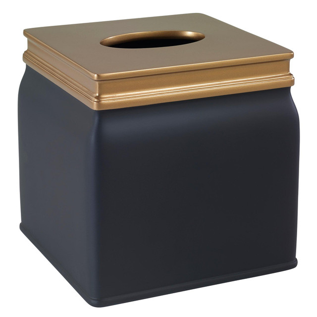 The Avanti Memphis Tissue Cover delivers a smooth matte black finish with beveled industrial accents in vintage gold metallic. Crafted in durable resin for long life. Full coordinating bath accessory collection is available. Imported. Measures 5.79 in x 5.79 in x 5.79 in.