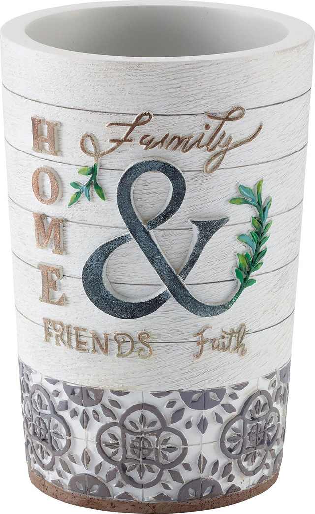 The Avanti Modern Farmhouse Tumbler is adorned with icons, words and phrases with a shiplap background and a floor tile border to bring one of today's most popular decorating motifs to your home. Crafted in great detail in hand-painted resin. Measures: 2.99'' x 2.99'' x 4.33''.
