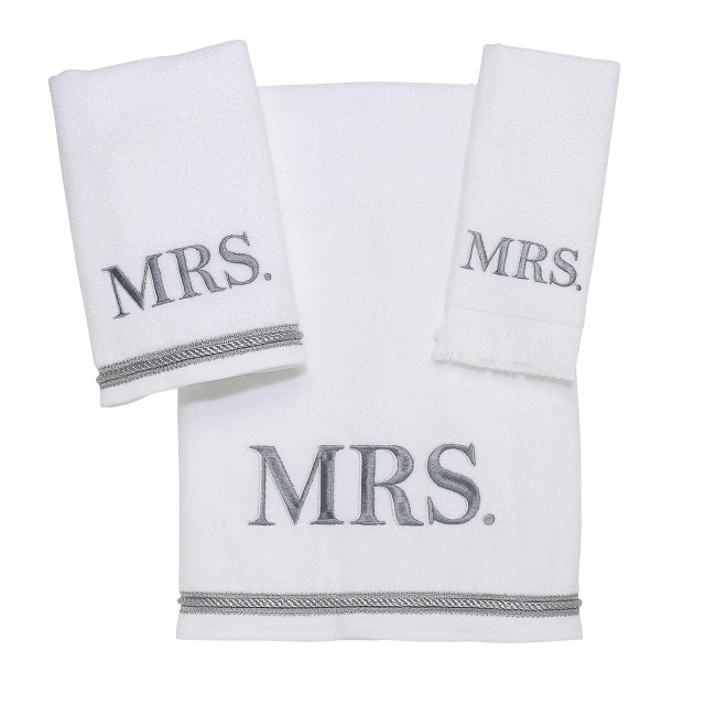 The Avanti Mrs. Towel Collection features embroidered MRS. with an embellished border. Made of 100% Cotton with embellishments. Machine wash on gentle cycle and tumble dry low. Bath Towel: 27 in x 50 in; Hand Towel: 16 in x 30 in; Fingertip Towel: 11 in x 18 in.