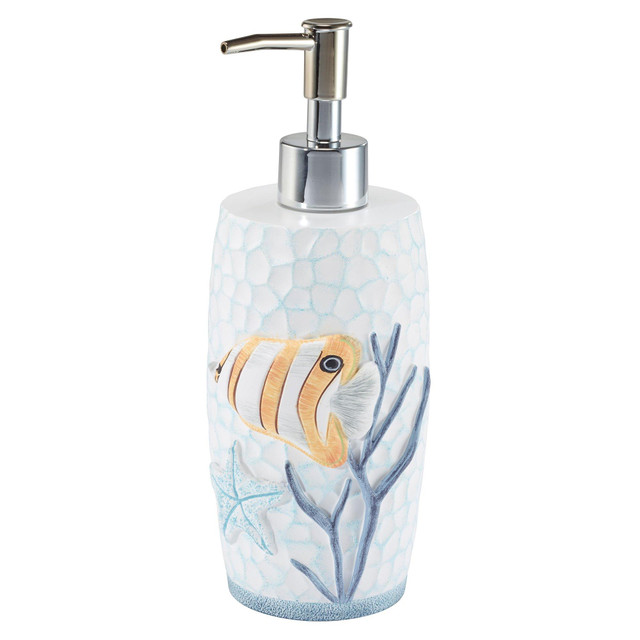 The Avanti Ocean Friends Lotion Dispenser features dimensional orange and white fish, with blue coral and starfish on a debossed white and blue ground with blue bottom border. Made of durable, hand-painted resin for easy care and long life. 3.25 in x 3.25 in x 8.5 in.