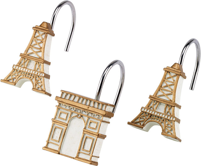 The Avanti Paris Botanique Shower Curtain Hooks feature 2 iconic designs, the Eiffel Tower and the Arc de Triomphe which adds the perfect finishing touch to any bathroom. Set of 12 hooks, 6 of each design. Measures: 1.88 x 1.38 x 1.5 inches.