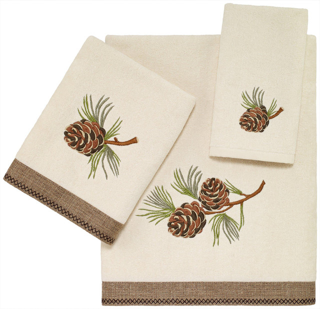 Bring the beauty of the outdoor to your bathroom with the Avanti Pine Valley. The ivory hand towel is embroidered in great detail with a pine cone and pine branch in shades of brown and green on a 100% cotton velour towel. A coordinating fabric border with whip-stichfinishes the look. The towel is embroidered and sewn in the USA of imported materials. Each towel sold separately. Measures 27 x 50 Bath Towel, 16 x 30 Hand Towel, 12 x 18 Fingertip.