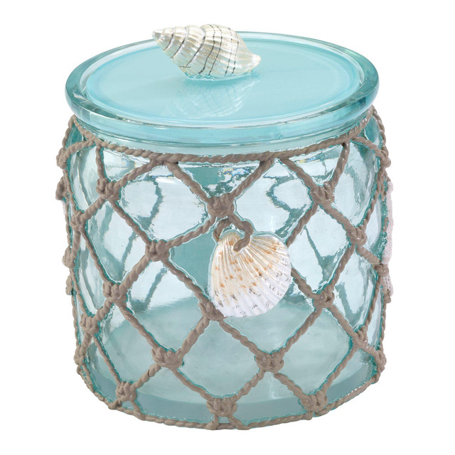 Avanti Seaglass Collection will add a coastal feel to your bathroom. Seaglass bathroom accessories are adorned with a fishnet & shells. Measures 5.10 in x 4.30 in x 4.30 in.