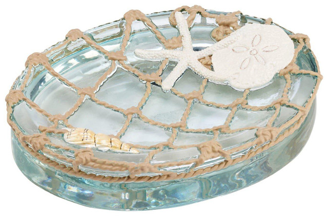 Avanti Seaglass Collection will add a coastal feel to your bathroom. Seaglass bathroom accessories are adorned with a fishnet & shells. Soap dish measures: 5.3'' x 4.3'' x 1''.