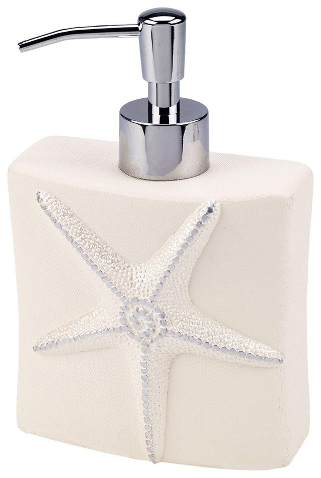 Avanti Sequin Shell will make your bathroom feel beach chic. Lotion pump features raised starfish on ivory background. Measures: 2.5'' x 4.5'' x 7''.