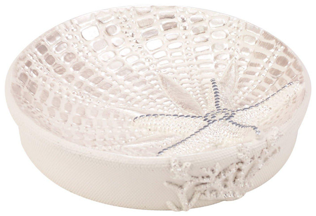 Avanti Sequin Shell will back your bathroom feel beach chic. Collection features raised assorted seashells on ivory background. Soap dish measures 4.6'' x 4.6'' x 1.0''.