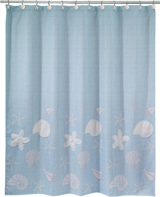Sequin Shell Shower Curtain by Avanti will bring the seaside into your bathroom. Curtain features print and embellished seashells and starfish scattered towards the bottom of the curtain. Measures 72'' x 72''.