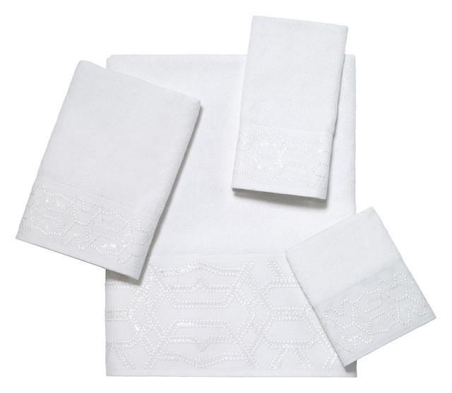 The Avanti Serafina Bath Towel is decorated with a dry, tonal fabric border with white embroidery forming a geometric pattern and clear sequins for a hint of shine. The white towel is sheared for an elegant, upscale look. Bath towel measures 27''L x 50''W. Hand towel measures 16''L x 30''W. Wash Cloth measures 13''L x 13''W. Fingertip towel measures 11''L x 13''W. Each sold separately.