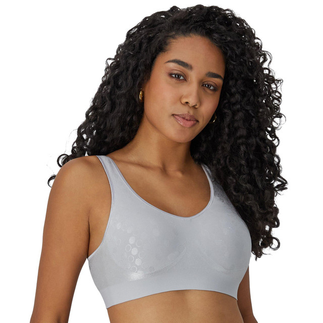 The Cool Comfort fabric Wirefree bra by Bali has patented knitting technology that targets back and side support. 360 soft comfort band and ultra-thin stretch foam provides comfort and fit flexibility. Built-up straps provide comfort. Comfort U Design ensures stay in place straps. Style #3488.