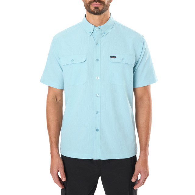 Our airy performance short sleeve shirt features a quick dry open weave textured breezy fabric made to keep you cool. Stylish with 2 flapped chest pockets with button closures, a button-down collar and a straight hem with side slits for a tidy look. Wear it to work or a night out in the summer.