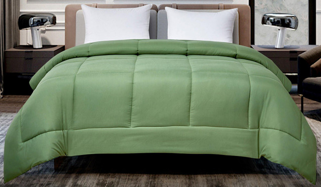 Add a splash of color to your bedroom with these microfiber reversible color down alternative comforters. Microfiber cover is reversible so changing your style is easy. Cover features 14 inch sewn through box design to ensure fill stays evenly disbursed. 100% hypoallergenic polyester fill.