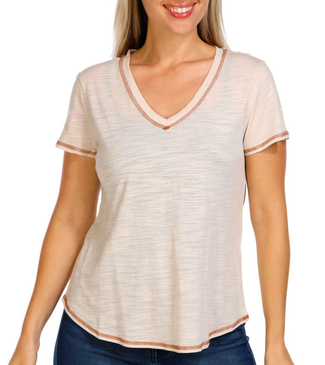 Discover the epitome of summer comfort with the Blue Sol Luxey Short Sleeve T-Shirt. Crafted from a soft fabric blend, this top offers a comfortable, lightweight feel thats perfect for warm days. Its solid-color design exudes a timeless elegance, while the V-neckline adds a touch of sophistication. The top length measures approximately 23 in. Fabrication is 60% cotton and 40% modal