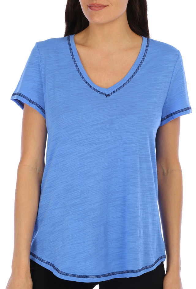 Feel good comfort meets timeless style in the Womens Solid Luxey Short Sleeve V-Neck Top. Featuring contrast thread detailing around the neckline and hems, it evokes a subtle athletic edge while maintaining a clean, versatile silhouette. The smooth drape and breathable fabric make it ideal for layering or wearing alone. Fabrication is 60% cotton 40% modal. Length measures approximately 26 in.
