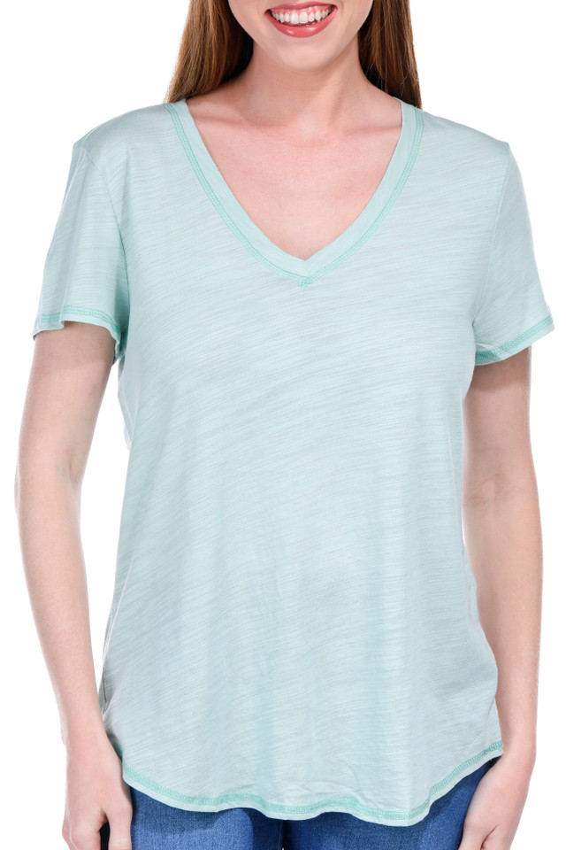 Feel good comfort meets timeless style in the Womens Solid Luxey Short Sleeve V-Neck Top. Featuring contrast thread detailing around the neckline and hems, it evokes a subtle athletic edge while maintaining a clean, versatile silhouette. The smooth drape and breathable fabric make it ideal for layering or wearing alone. Fabrication is 60% cotton 40% modal. Length measures approximately 26 in.