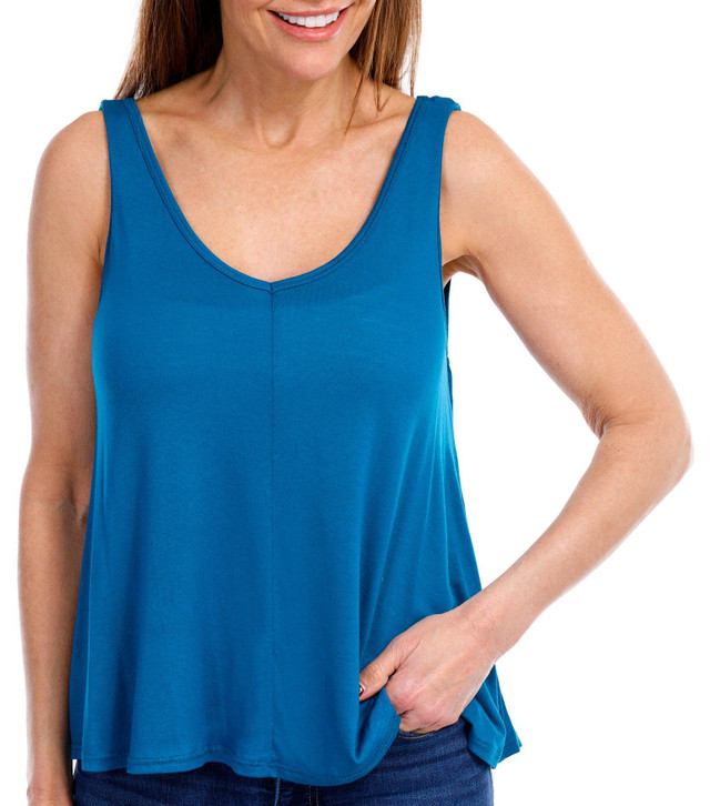 This sleeveless top features a solid color design, a v-neckline, a v-back, and swing styling. Measures approximately 23 in. Fabrication is 95% rayon and 5% spandex.