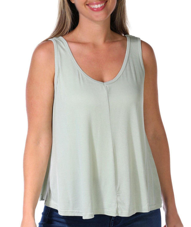 This sleeveless top features a solid color design, a v-neckline, a v-back, and swing styling. Measures approximately 23 in. Fabrication is 95% rayon and 5% spandex.