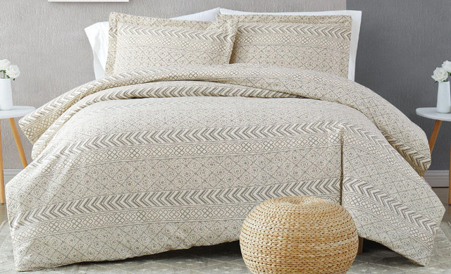 A modern take on a traditional stone tile style print with horizontal bands appearing as stripes from a distance but are more complex as you get closer to the face print on 100% cotton woven fabric. Includes comforter and 2 shams (Twin comes with 1 sham). Face is 100% cotton, reversing to 100% microfiber. Filled with 100% polyester.