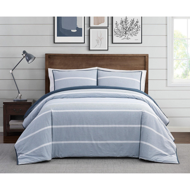 This comforter set features stylish horizontal yarn dye stripes which means that the color maintains its look for years to come. Includes comforter and 2 pillow shams (1 twin).