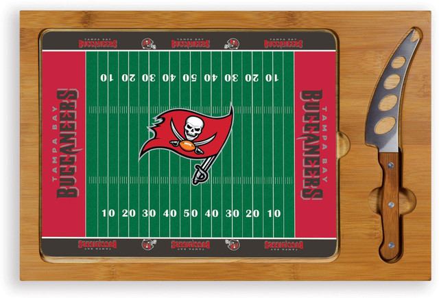 The Icon Tamps Bay Buccaneers Cutting Board is a 3-pc. set that has a solid rubberwood base with a bamboo rim accent, a tempered glass lid, & a cheese knife with its own carved out area in the wood base. Measures 15.2''L x 10''W x .8''H.