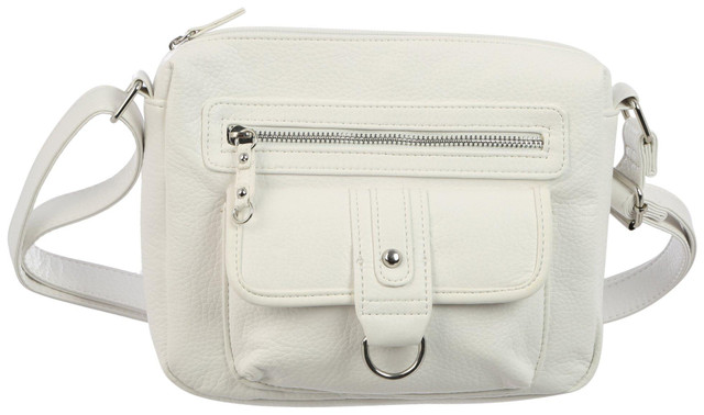 This crossbody handbag features a solid color design on soft, grainy washed, vegan leather fabrication, one front snap flap pocket with D-ring detail, one zipper pocket, one rear slip pocket, a crossbody adjustable strap, and a top zipper closure. The lined interior contains one zipper pocket and two slip pockets. Handbag measures approximately 9 in. L x 2 in. W x 7.5 in. H.